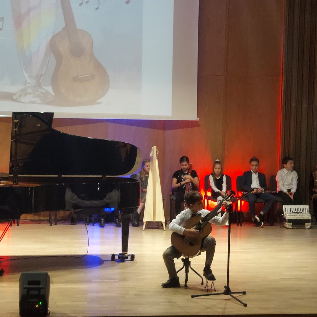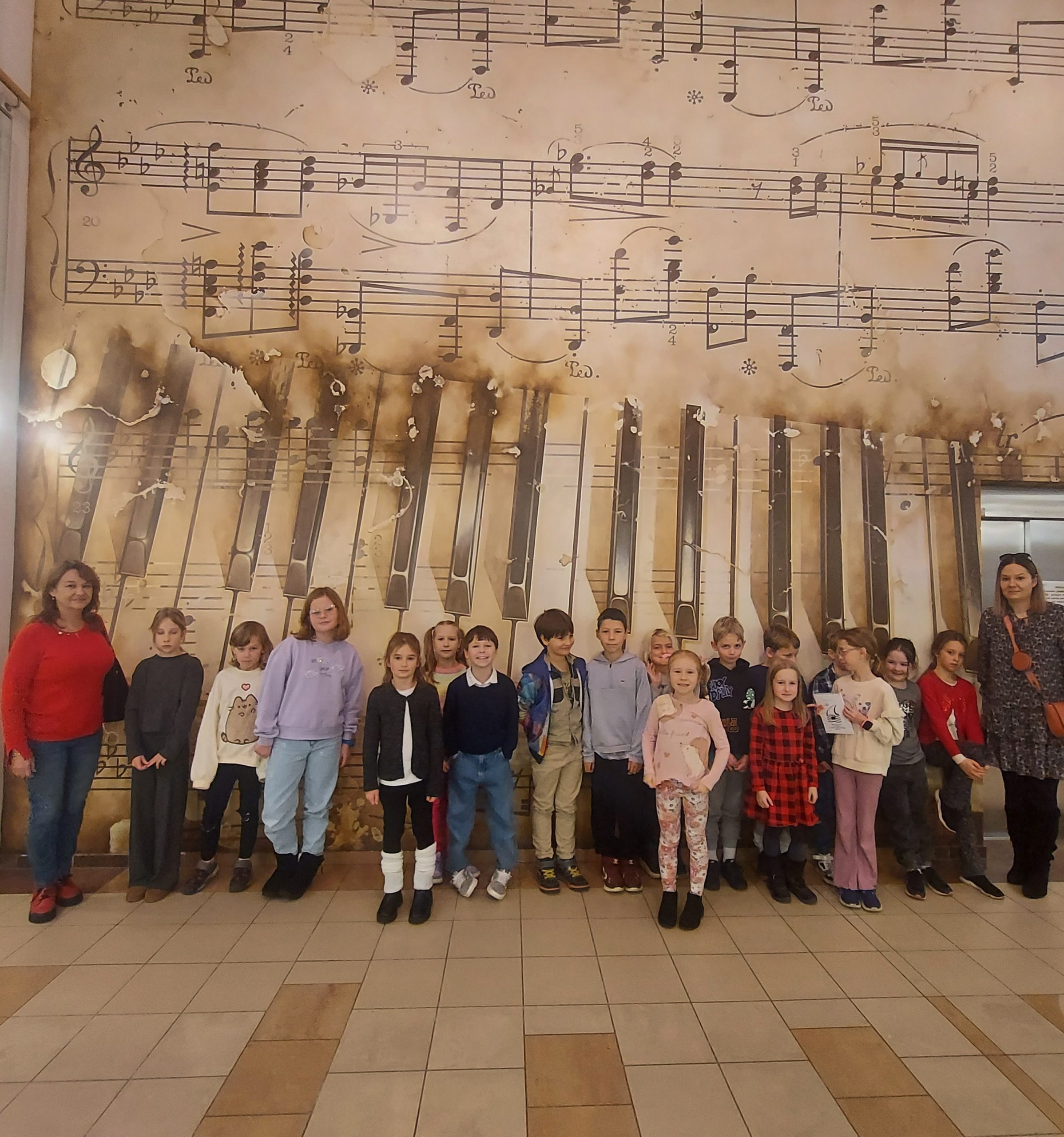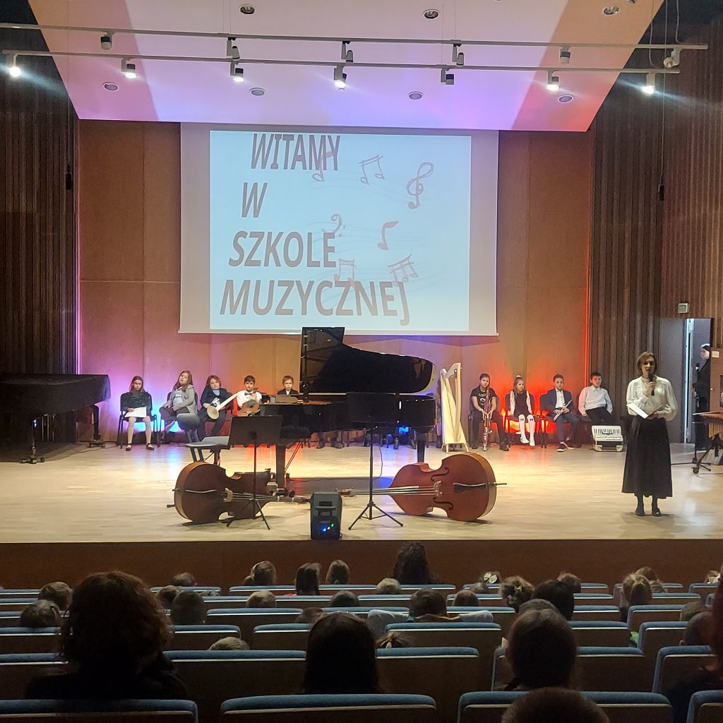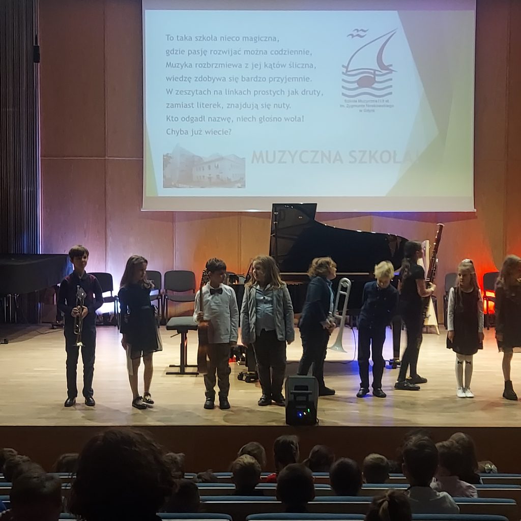 6 listopada klasa 2 B wybrała się do Szkoły Muzycznej w Gdyni na koncert w wykonaniu uczniów tej szkoły. Mieliśmy okazję posłuchać na żywo utworów granych na saksofonie, harmonii, trąbce, fortepianie, flecie, harfie, kontrabasie, gitarze i ksylofonie. Gromkimi brawami nagradzaliśmy wszystkich wykonawców. Jednak najgłośniej klaskaliśmy naszemu koledze z klasy Adamowi Lidke, który grał utwór na gitarze. Na zakończenie koncertu wybrane osoby z widowni czytały muzyczne zagadki. Jedną z nich była nasza koleżanka z klasy. Na wszystkie pytania potrafiliśmy prawidłowo odpowiedzieć. To już druga nasza wizyta w Szkole Muzycznej. Może za rok znowu się tam wybierzemy.