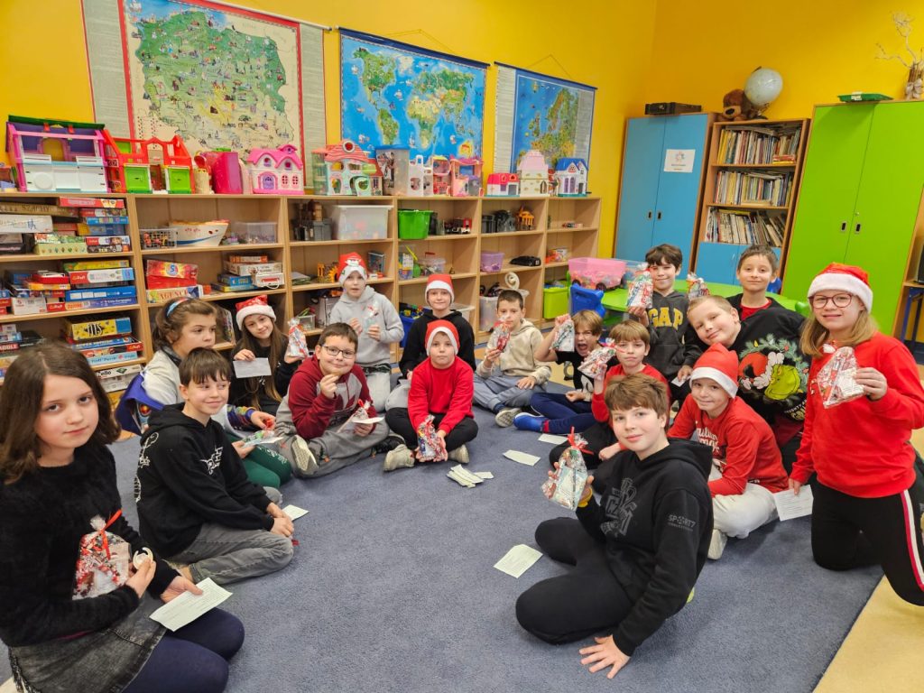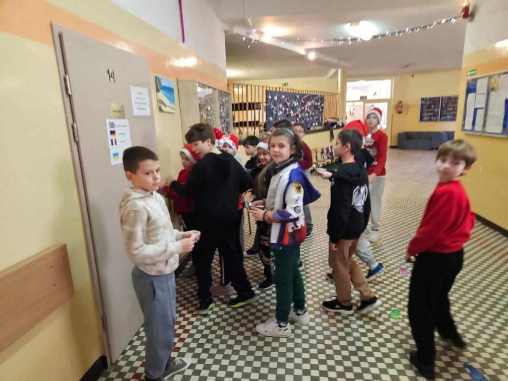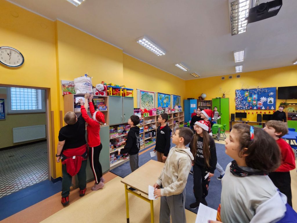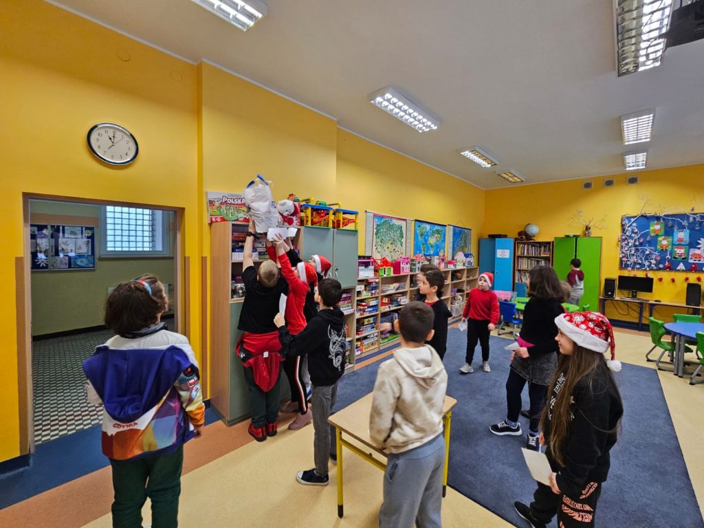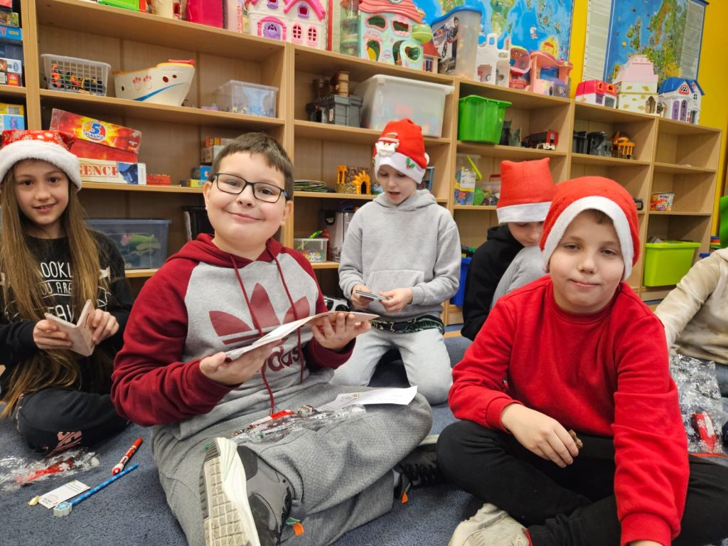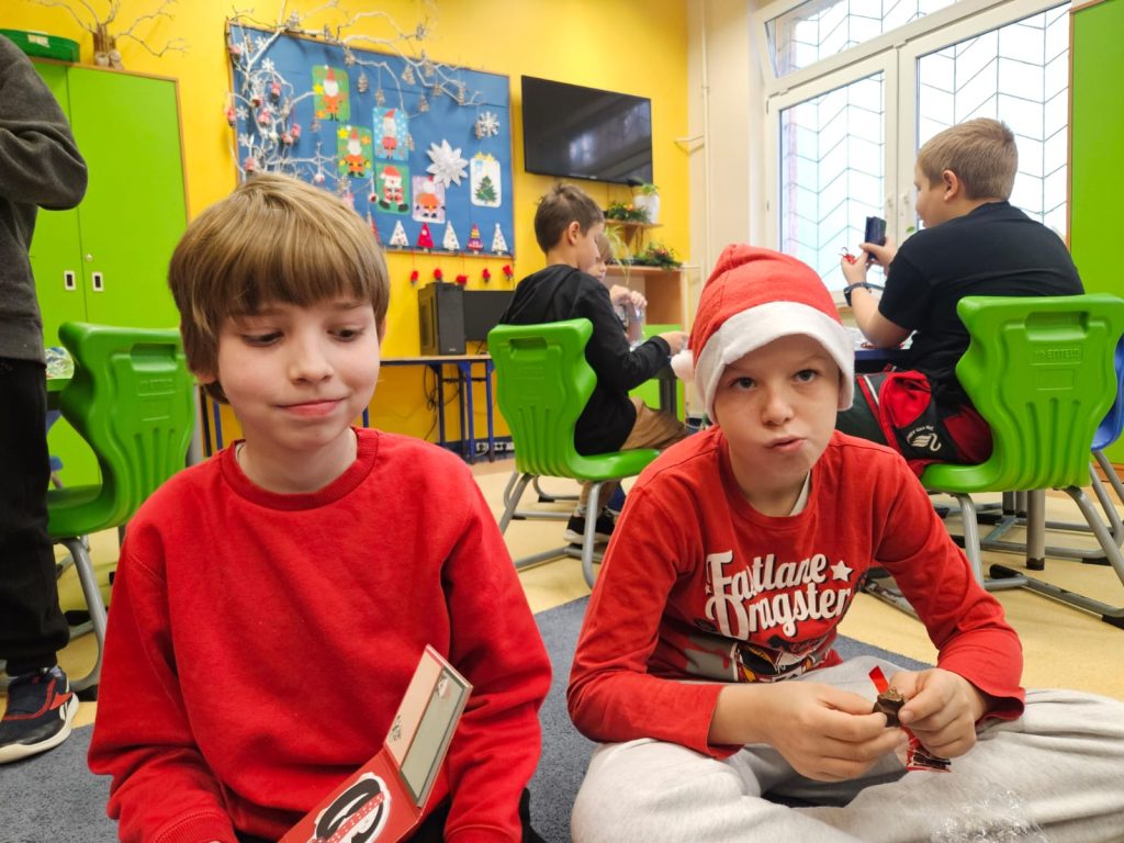 Mikołajki w klasie 4C polegały na wspólnej zabawie w szukanie prezentów ukrytych w szkole. Uczniowie podążali za wskazówkami napisanymi po angielsku przez Świętego Mikołaja, które prowadziły ich do kolejnych miejsc. Zabawa była pełna radości i współpracy. Na końcu wszyscy odnaleźli prezenty i wspólnie świętowali. 🎁😊