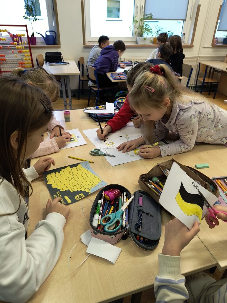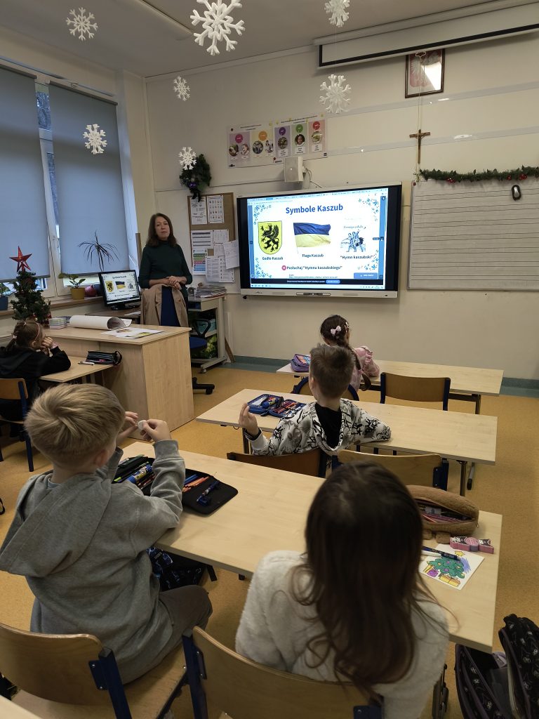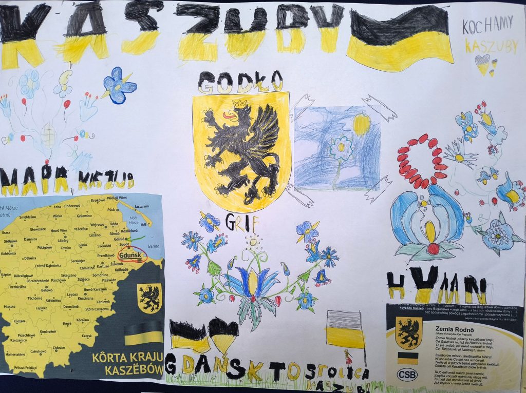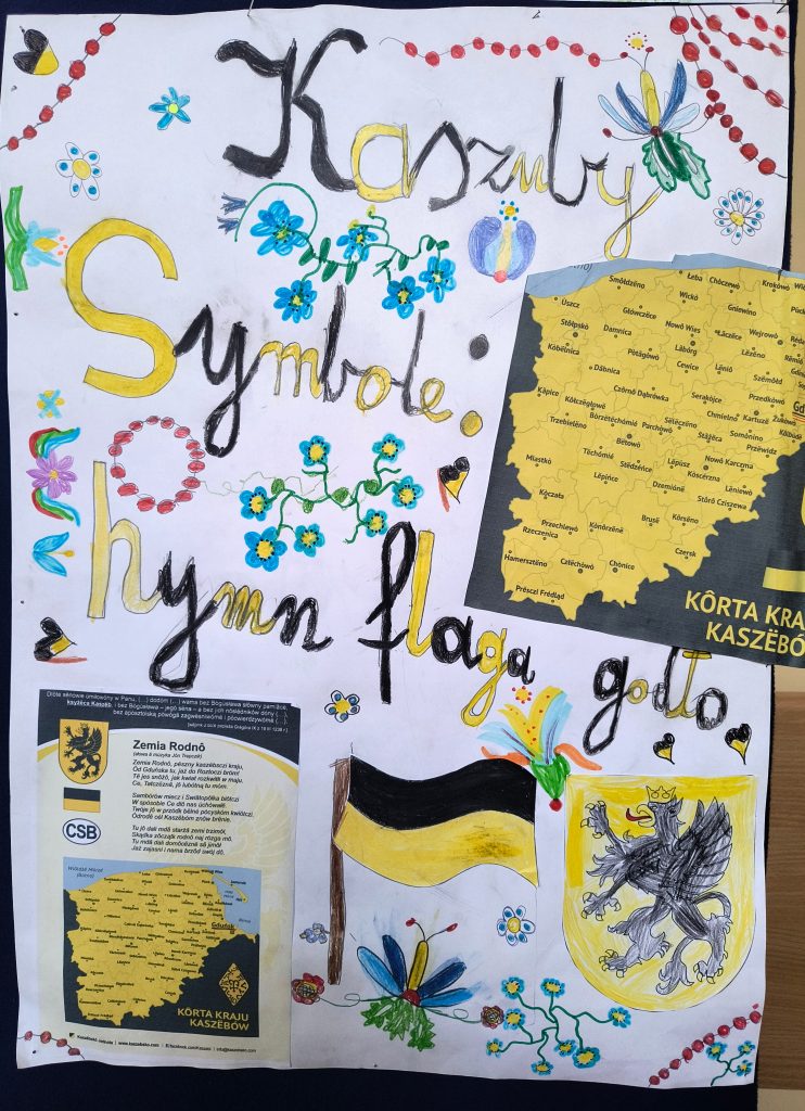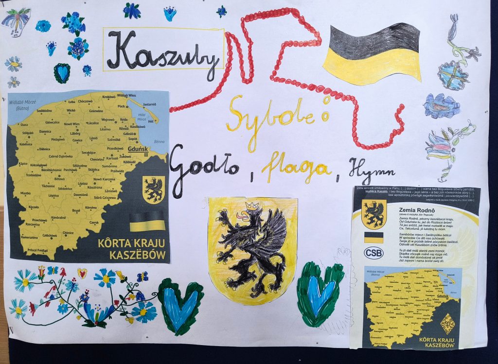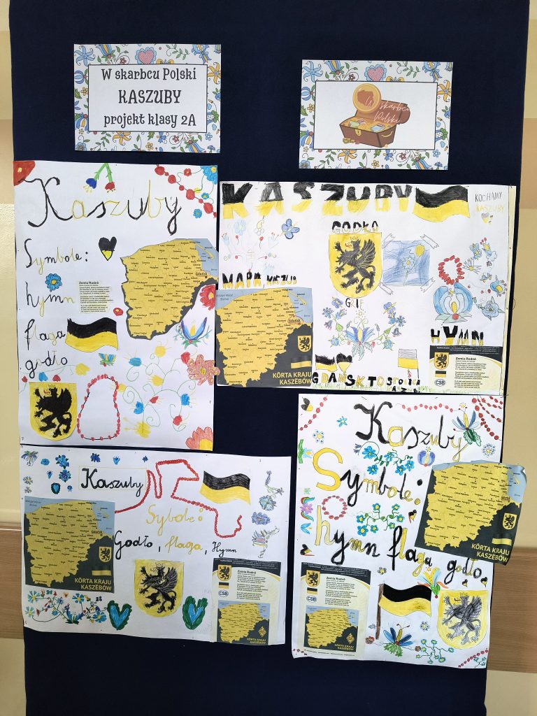 Uczniowie klasy II A, pod opieką nauczycieli bibliotekarzy, rozpoczęli swoją przygodę z poznawaniem regionu, w którym mieszkają – Kaszub. Na początku dzieci obejrzały mapę Polski z podziałem na regiony etnograficzne, wskazywały położenie Kaszub oraz poznały „stolicę” regionu i ważniejsze miasta. Po takim wstępie wyruszyły na poszukiwanie skarbów. Odnalazły informacje o symbolach swojej małej ojczyzny, takich jak flaga, godło i hymn.