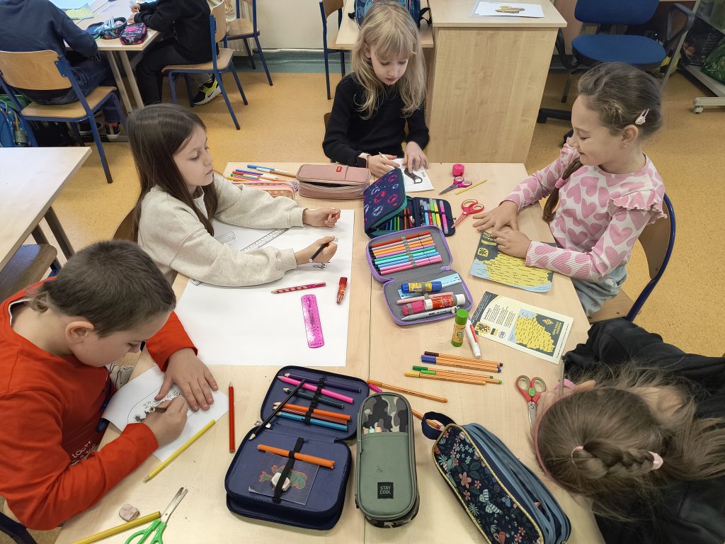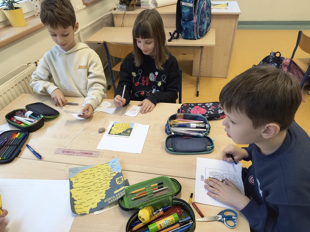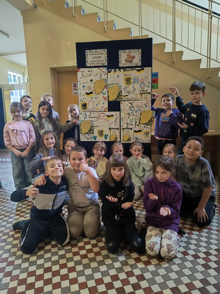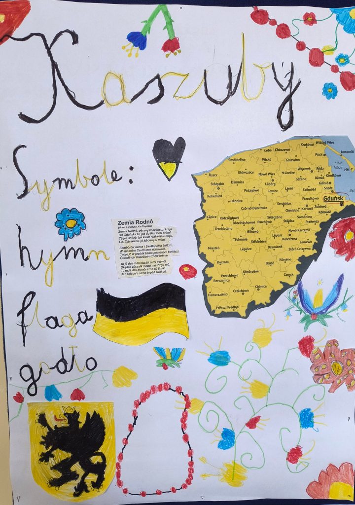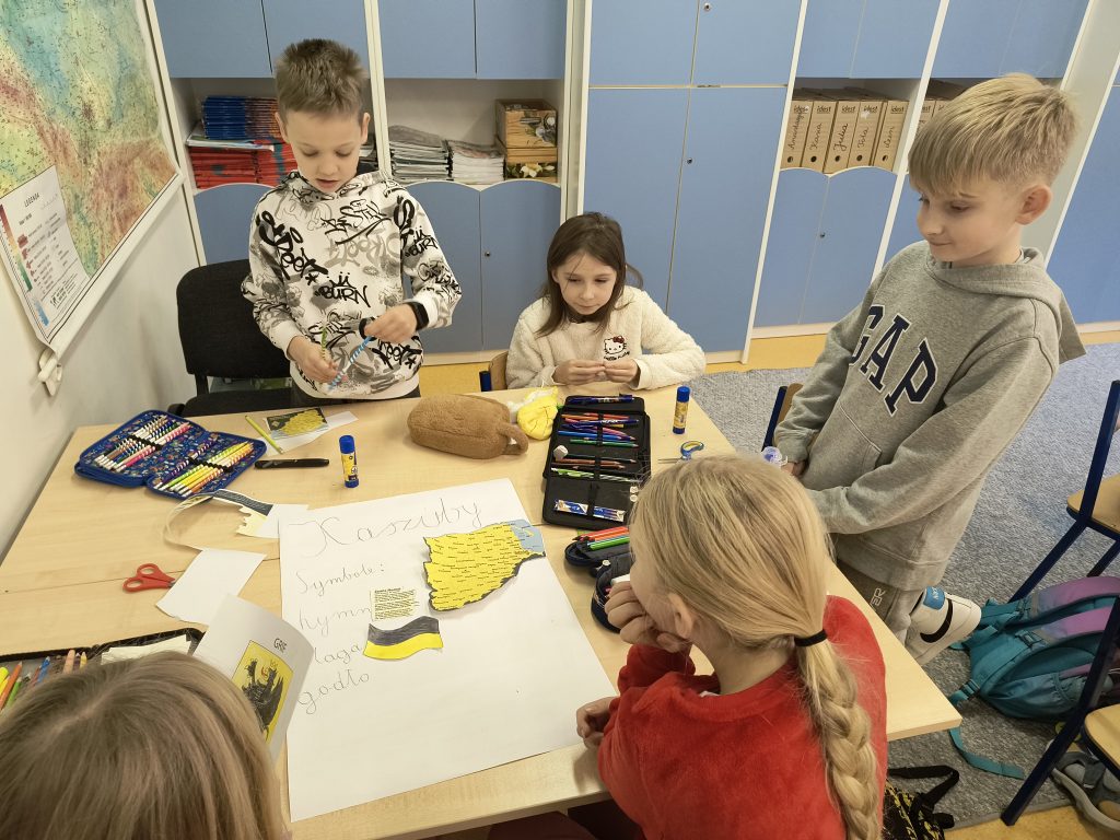 Uczniowie wysłuchali również pięknej legendy o powstaniu Kaszub, według której Bóg stworzył je z resztek, co tłumaczy różnorodność form krajobrazu – jezior, rzek, lasów i pagórków. Podsumowaniem zdobytej wiedzy było przygotowanie przez dzieci, pracujące w grupach, pięknych plakatów, które następnie zostały zaprezentowane na wystawie w szkolnym korytarzu.